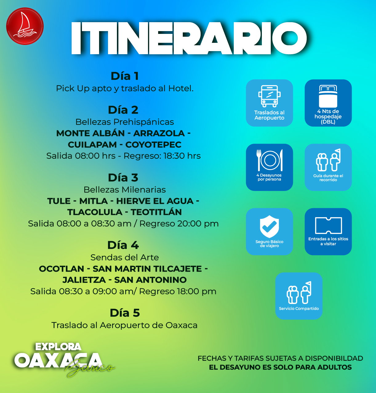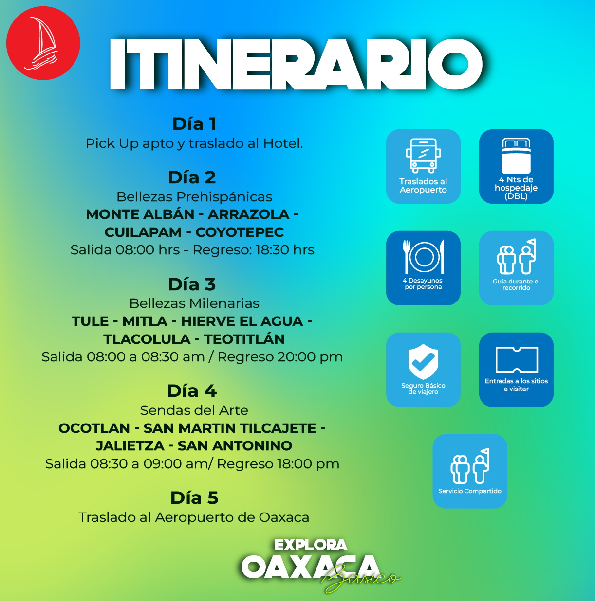 Este día finalizamos con el traslado al aeropuerto de la ciudad de Oaxaca, concluyendo así nuestros servicios